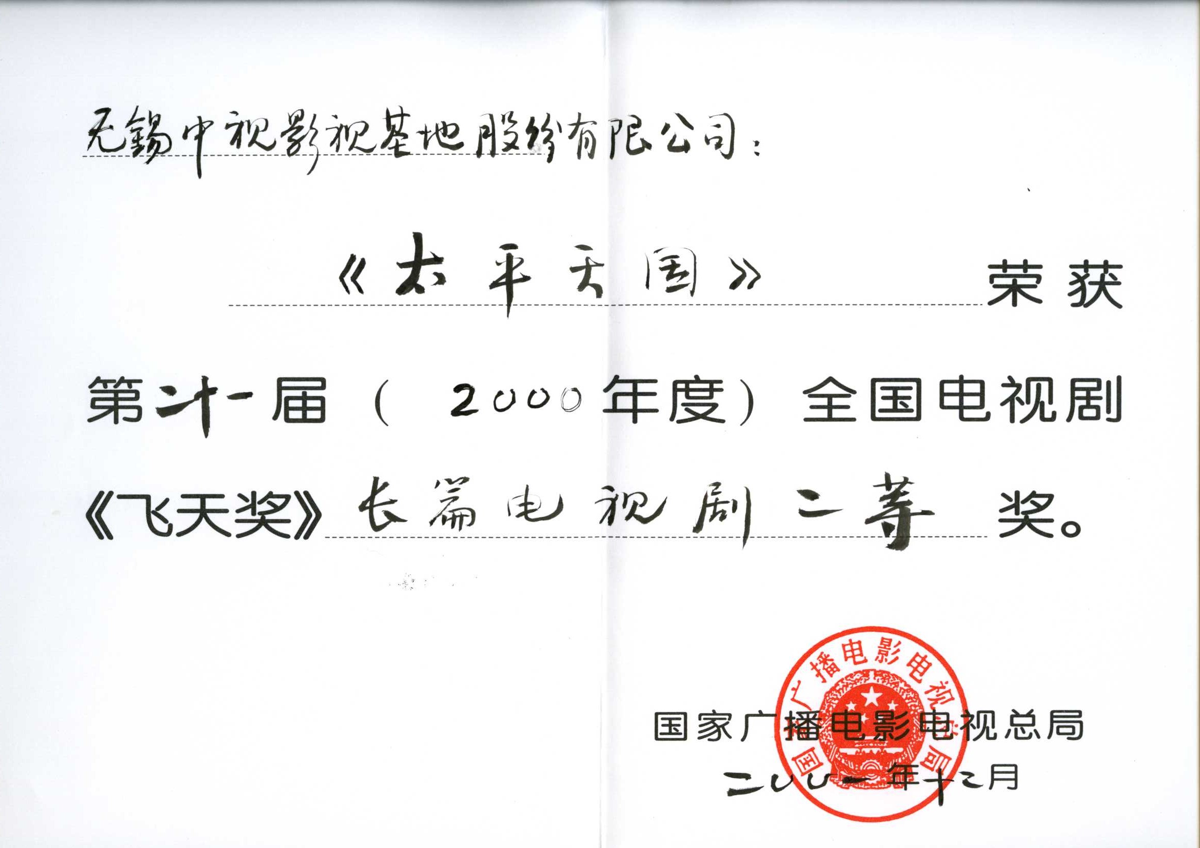 2001年(nian)《太平天國(guo)》獲第二十一(yi)屆全國(guo)電(dian)視劇“飛天獎”長(zhang)篇電(dian)視劇二等(deng)獎