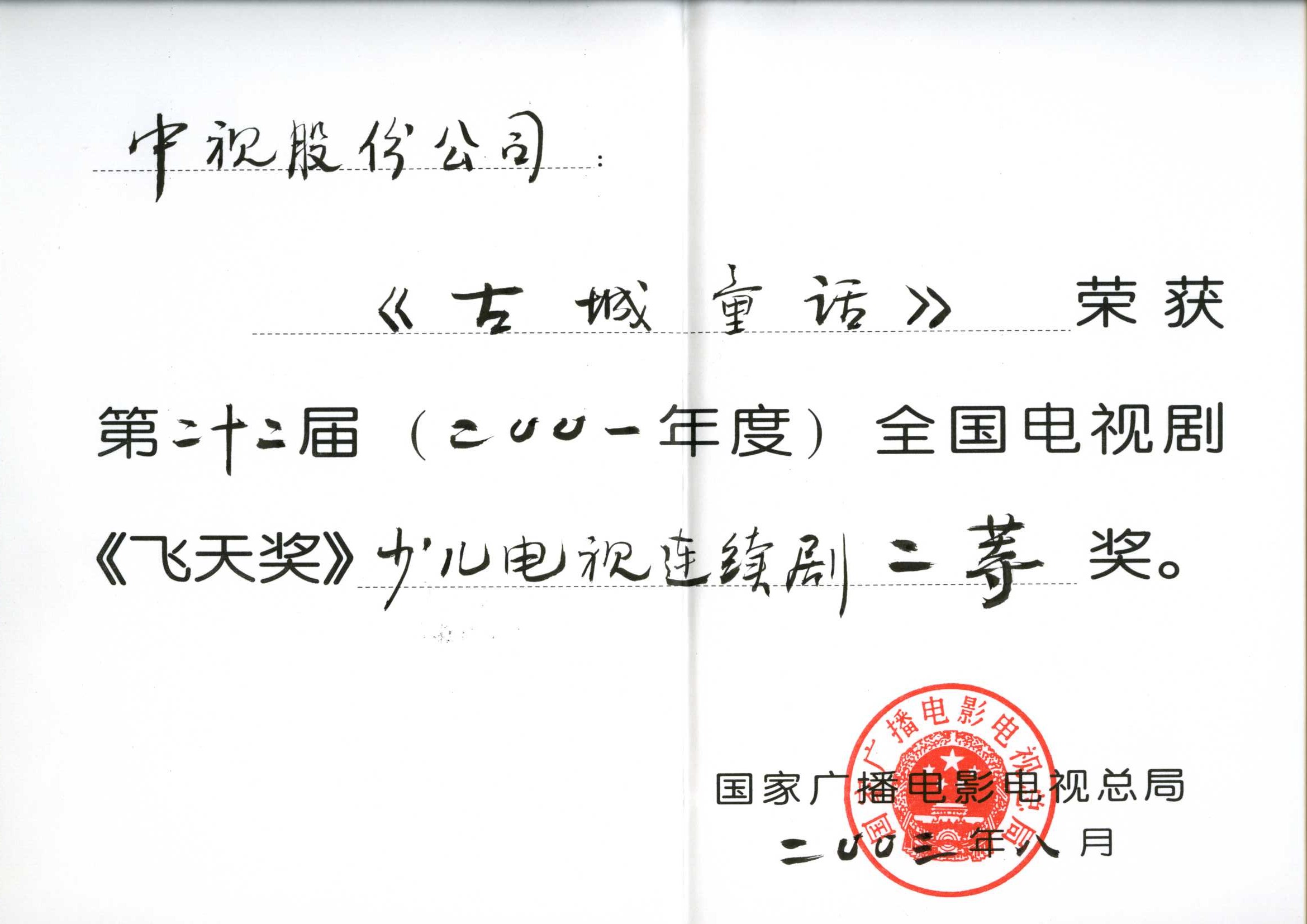 2003年(nian)《古(gu)城(cheng)童話(hua)》獲第二十二屆全國(guo)電(dian)視劇“飛天獎”少兒電(dian)視連續劇二等(deng)獎