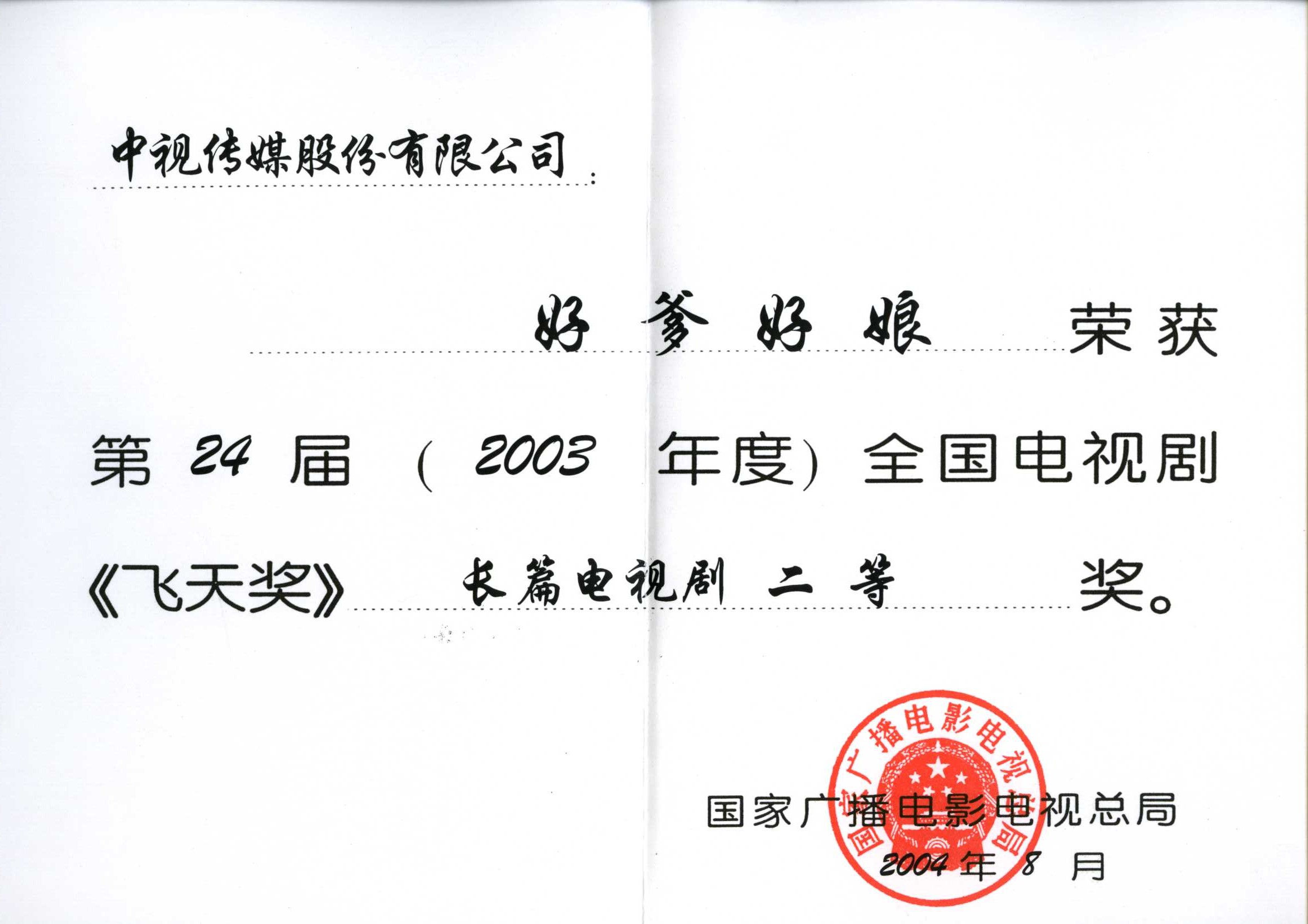 2004年(nian)《好爹好娘》獲第二十四屆全國(guo)電(dian)視劇“飛天獎”長(zhang)篇電(dian)視劇二等(deng)獎